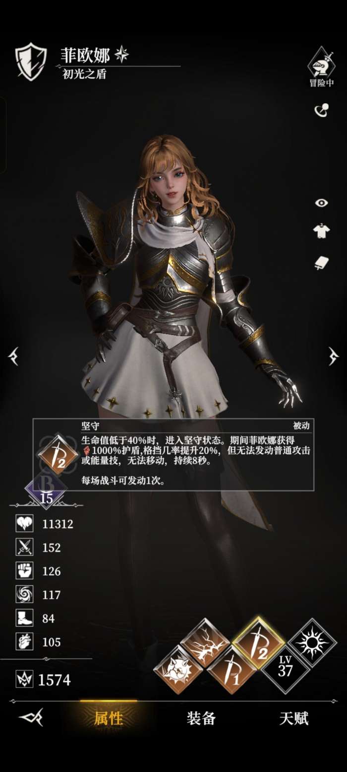 坦克位:菲欧娜-初光之盾(开局免费赠送),被动格挡弹反+ 40% 血量以下高额护盾,群体控制能力顶尖;