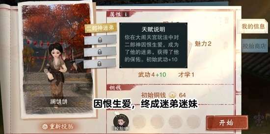 ⑤地摊传奇:你靠着摆地摊卖月饼攒下一笔积蓄,身上也总有五仁的香味。初始金钱+30,初始魅力+5。