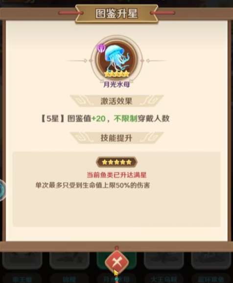 生存向阵容侧重团队持续作战能力与容错空间,应重点配置生存防护类限定鱼。具备阵亡触发护盾效果的鱼类,可在关键单位退场时为队友提供即时防御缓冲;而兼具伤害减免与生命回复效果的鱼类,则更契合坦克体系需求,有效削弱敌方群体高伤技能带来的整体减员压力。月光水母即为此类代表,其被动效果使自身所受伤害上限锁定为当前生命值的50%,大幅延长前排存活时间,并间接提升全队生存窗口与操作容错率。