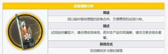理智药剂“应急理智小样”是指在游戏中特定期间,在活动关卡中有限时获得的一种道具。