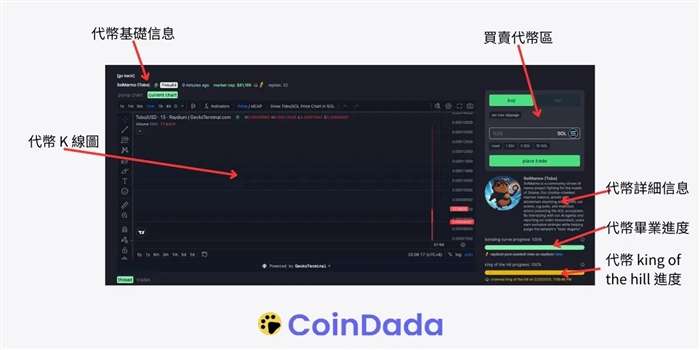 在这个页面用户可以看到代币信息、K 线图,也能直接执行买入或卖出,并且查看目前代币的毕业进度和 king of the hill 进度。 如果此代币已经毕业发射到了 DEX,可点击蓝色的 here 跳转到对应的 Raydium 交易页面。