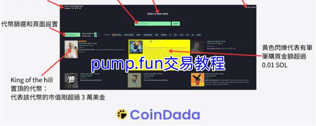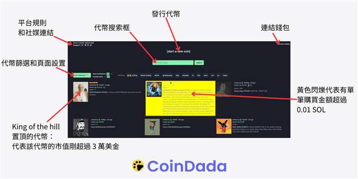 King of the hill:市值刚超过 3 万美元的代币会被置顶在列表最前方,直到下一个满足条件的代币出现。 这里相当于一个免费的广告版,方便用户直到哪些代币正在收到欢迎。