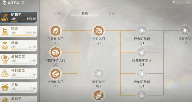 另外还有三种精炼材料,分别就是巴鲁矿石、奴娜矿石、阿兹特矿石。要想获取那玩家首先就需要打开生活职业选择矿物学,在这里就有三个技能,三个技能所对应的就是三种矿石。玩家可以先选择入门技能,然后点击信息之后就可以迅速的找到巴鲁矿,通过追踪传送的方法就可以直接送到附近的传送点,找到矿石之后马上就可以开工,基本上每挖一个矿,那么全部都会消耗10点精力。玩家可以获得2点职业,还有5个巴鲁矿。