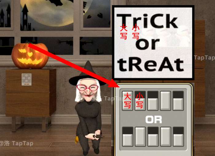 24.点击女巫后方南瓜上的机关,结合【23】中亮太说的句子字母的大小写,调整机关;打开南瓜头,获得【骷髅头2】,之后会用到