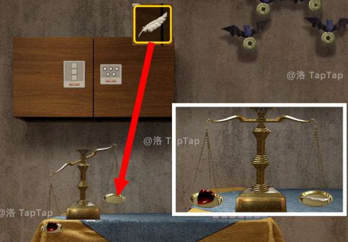 29.点击大门旁的柜子上方的抽屉,根据【28】中蜡烛的长短,调整机关;打开抽屉,获得【羽毛】