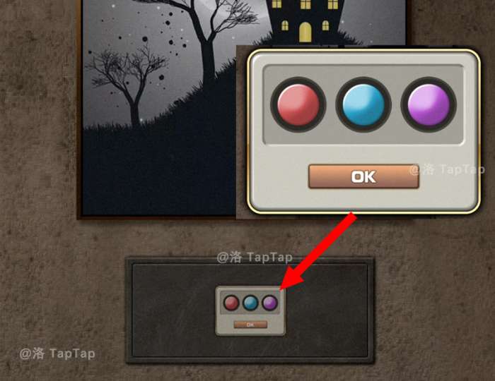 6.点击画像下方机关,根据【5】中顺序,依次点击【蓝-红-蓝-红-红-紫】;打开暗格,获得【纸条】