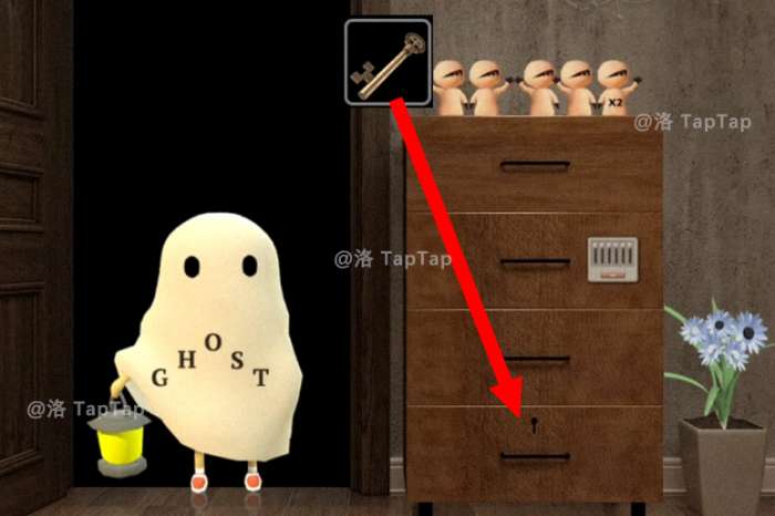 22.根据【20】中鬼魂运动轨迹【右-下-左-左-上-上-右-右】,调整机关;打开柜子,获得【骷髅头1】和【钥匙2】,先放一放,之后会用到