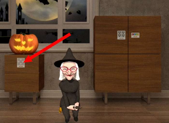 35.点击女巫右后方柜子的右侧门,将【34】中获得的【红S-蓝H-绿O-黄W】输入机关;打开柜门,获得【骷髅头3】