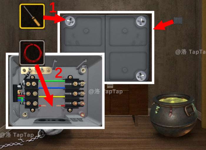 33.来到小房间,使用【螺丝刀】依次卸掉面板上的螺丝;打开面板,露出下方断开的电线,接着将【31】中获得的【一捆电线】用在此处,修复电路