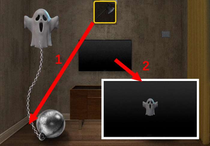 20.来到小房间,用【斧头】劈开栓住鬼魂的铁链,鬼魂会飘到电视机里;记录下电视机中鬼魂的运动轨迹