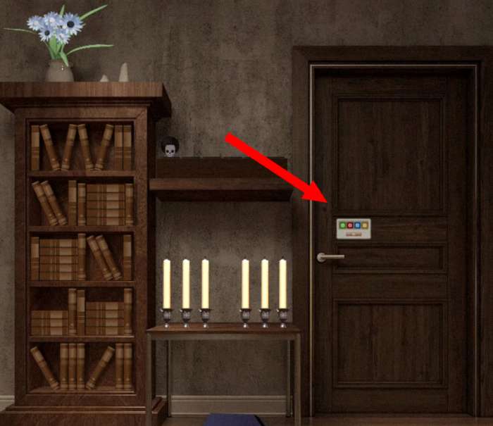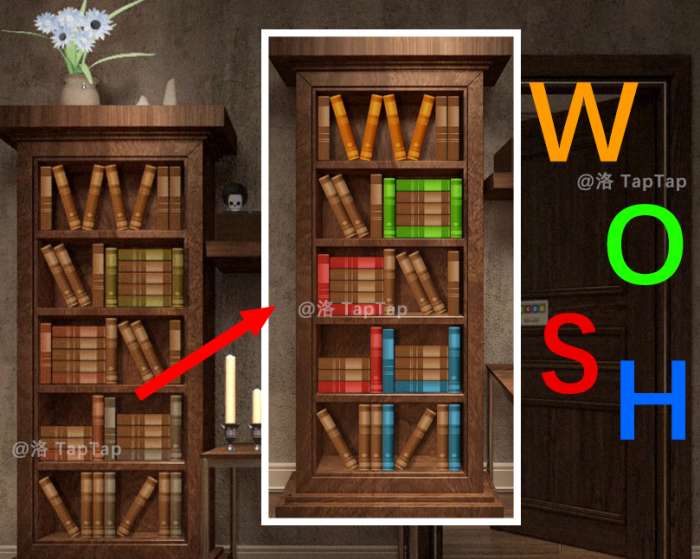34.电路修复后来到大房间可以看到书架上方的灯打开了,在灯光的照耀下,书架上的书本组成了不同颜色的四个字母【红S-蓝H-绿O-黄W】