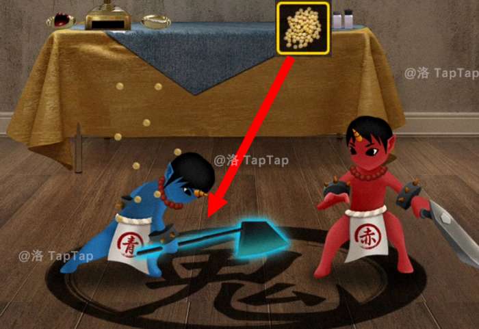 19.将【黄豆】撒向两个小鬼,小鬼消失,在原地留下 一柄【斧头】,点击获取