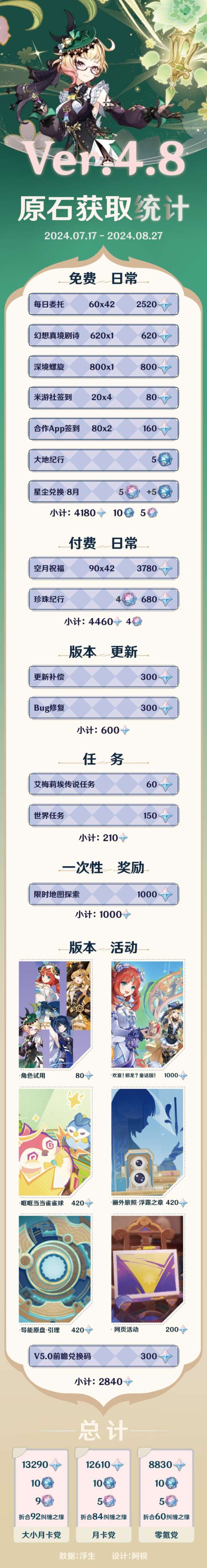 根据已知信息和版本更新内容,本篇攻略将尽可能详细和准确地计算出4.8版本(从具体更新日期2024年7月17日开始,到2024年8月27日共计42天的时间)可获得的原石数量,以便大家更好地规划接下来的角色和武器抽取。