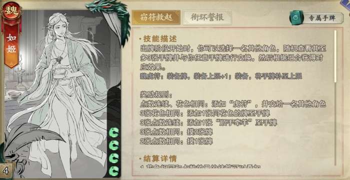 如姬在运用此技能换牌时,有着明确的优先级策略,她会优先尝试达成条件三,即同时满足点数连续和花色相同,因为这一组合能够带来最为丰厚的奖励,包括顺手牵羊、同花色牌以及虎符,增强自身在游戏中的资源获取能力,若无法达成条件三,则会退而求其次,优先努力达成条件一,即三张牌点数连续,以获取顺手牵羊这一实用道具,增加对其他角色手牌的掌控能力。