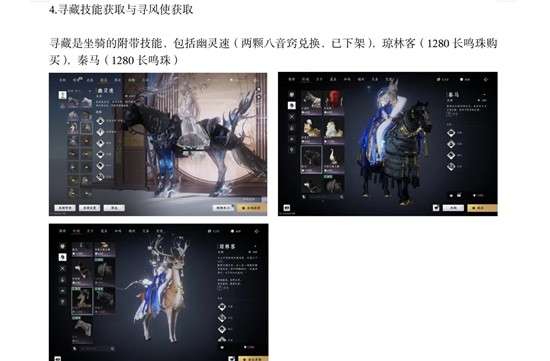 寻藏是坐骑的附带技能,包括幽灵速(两颗八音窍兑换,已下架),琼林客(1280长鸣珠购买),秦马(1280长鸣珠)
