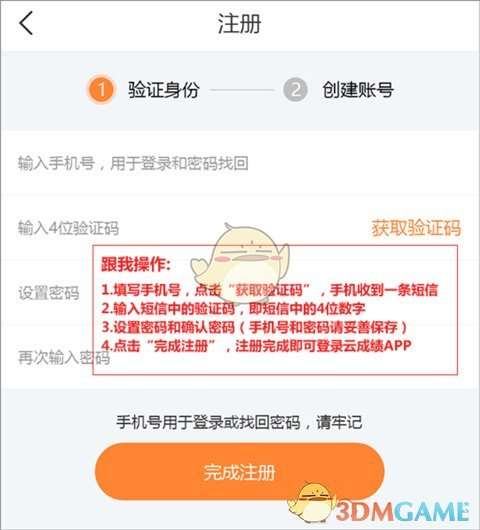 验证身份后需要填写手机号,点击获取验证码,在验证码位置输入收到的短信验证码,设置密码和确认密码即可完成注册;
