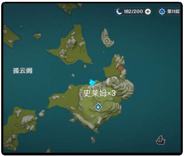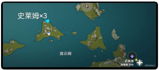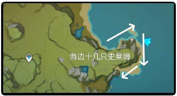 图解:这个是水史莱姆的聚集地,是我找到的攻略中最靠谱的,很易找,先去到云来海这个锚点,走到崖边飞下去可以看到沙滩边有史莱姆。