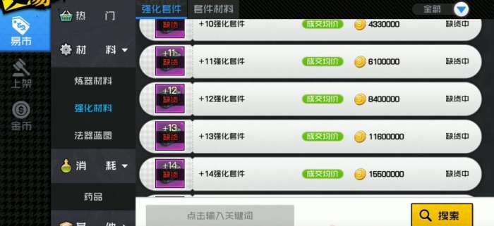 如此重要的装备等级提升道具自然不会让各位玩家轻易获得,在游戏中相对简单粗暴的获取方法就是在易市直接花费大量金币购买相对应的强化套件,从而突破我们当前的装备等级瓶颈。当然,如果我们强化套件非常多,有一些已经完全用不上的话,也可以将强化套件上架到易市中,从而换取大量的金币。