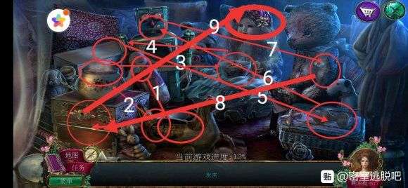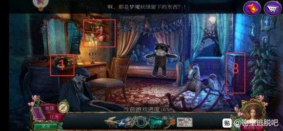 5点击瓶塞使用镊子得到半张明信片,在诺拉的房间3处使用半张明信片和胶带得到明信片和噩梦捕捉网,对着小熊使用噩梦捕捉网