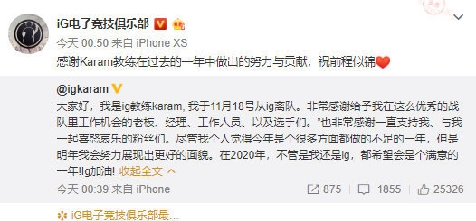 如今Karam在冬季转会期第 一天辞职,意味着IG正式进入到转会动荡期,他们首先就要考虑合适的主教练人选,而能够执教IG的教练不多,很多教练的战术理念与IG的风格不同,贸然启用新教练会导致IG在新赛季发布会不出自身实力。