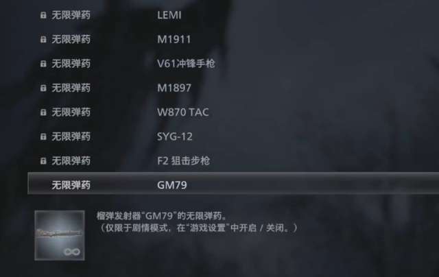 LEMI(手枪)M1911(手枪)V61冲锋手枪(手枪)M1897(霰弹枪)W870 TAC(霰弹枪)SYG-12(霰弹枪)F2狙击步枪(狙击步枪)GM 79(榴弹发射器)M1851狼毒(马格南)S.T.A.K.E.(马格南)WCX(突击步枪)USM-AI(手枪)龙击(突击步枪)手炮PZ(马格南)火箭式手枪(特殊)启用无限弹药不会影响奖杯/成就的解锁,因此可以放心启用。