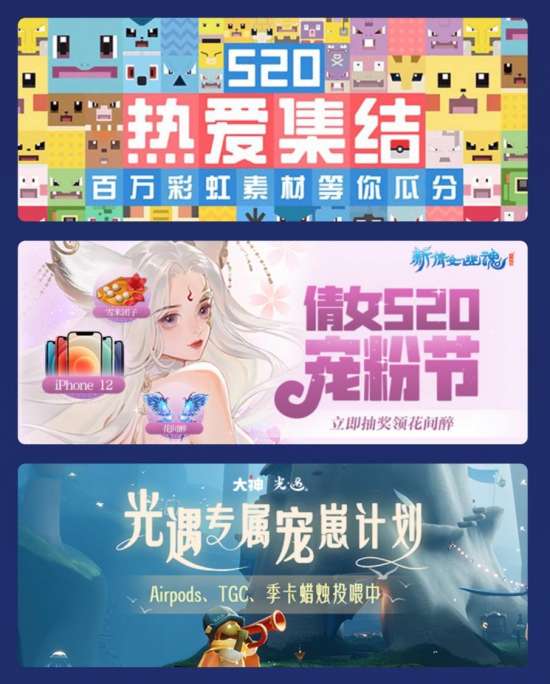 趣味玩法欢享不停,圈子宠粉各有千秋!《光遇》独家宠崽计划深情告白玩家,《倩女幽魂》520告白情意浓,萌力MAX的《宝可梦大探险》邀玩家一起在线收集彩虹.....