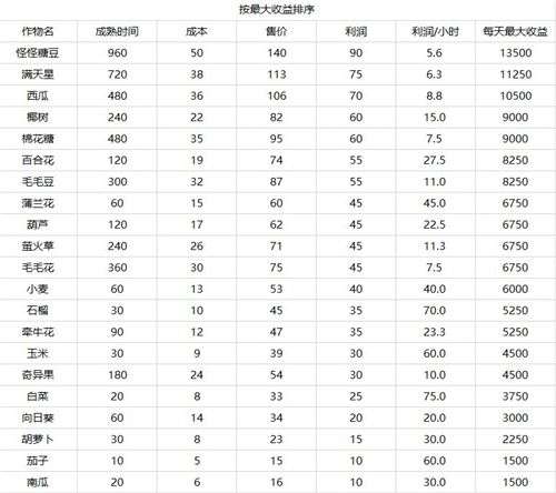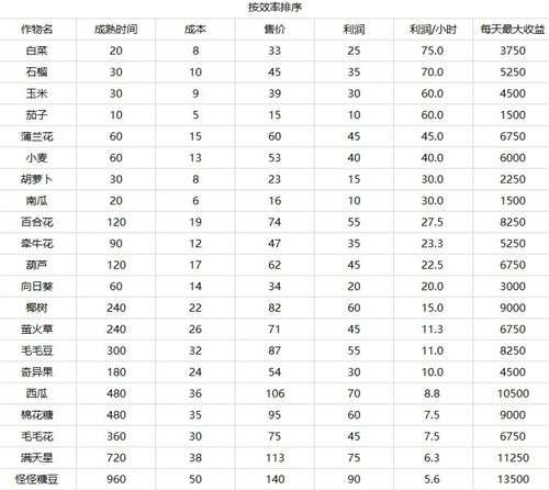 如果是按照单小时利润排序,那么“白菜>石榴>玉米>茄子>蒲兰花>小麦”,可参这个来选择性种植。