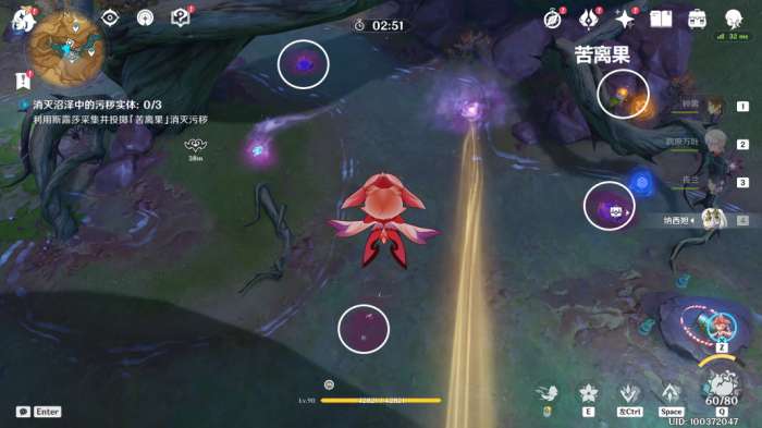 (2)我们先操控「花灵」,靠近荆棘枝条,短e一下来驱散紫雾