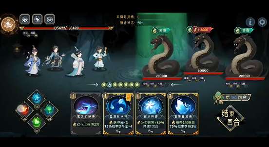 第五回合:天悟上人打出三清化水符、五行化水咒和断水龙威,柳盈打出玄冰神破和玄冰九变,吕风复制玄冰九变并全部打出,击杀蛇2。此时如果血量扛不住可变化为复制1次玄冰九变+云中子打出百转叠浪诀,然后击杀蛇2、3,保留蛇1。