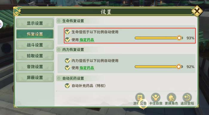 弓手防御力低,再加上本身就是“脆皮”职业,跟boss硬拼是不可能的,这时候就要发挥弓手的远程输出能力了,这里我选择关闭自动挂机,因为这时候自动挂机只会死的更快,在这之前记住开启自动回血设置
