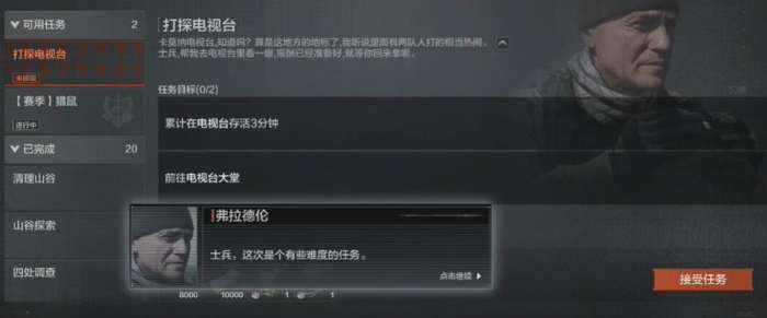 答:累计在电视台存活3分钟,前往电视台大堂即可完成任务。