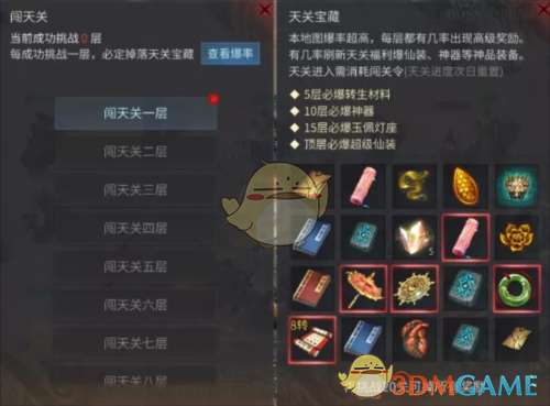 天关共计20层,共有20件宝物,每过一层必得一件。值得注意的是:5层必爆转生材料,10层必爆神器,15层必爆玉佩灯座,顶层必爆超级仙装。在闯关之前可以看到天关内的宝藏,天关宝藏次日更新,每日奖励有变化,玩家们可以按照需要进行闯关。