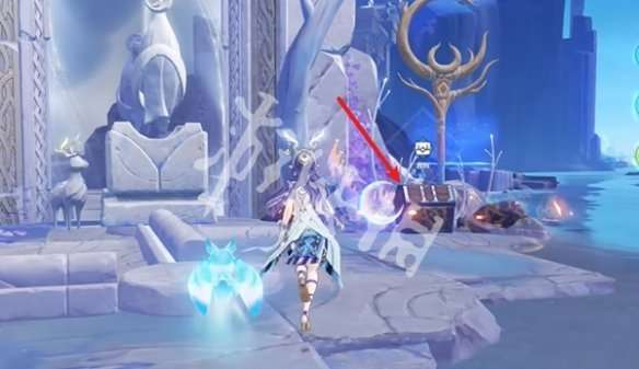 3、绕到雕像的左侧,对准蓝色光点,按下互动键,将其推动过去即可。