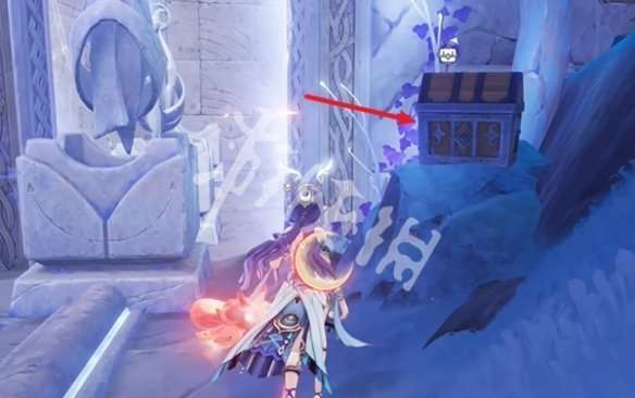 4、回到宝箱前的雕像,对准雕像红色的光点按一下互动键。