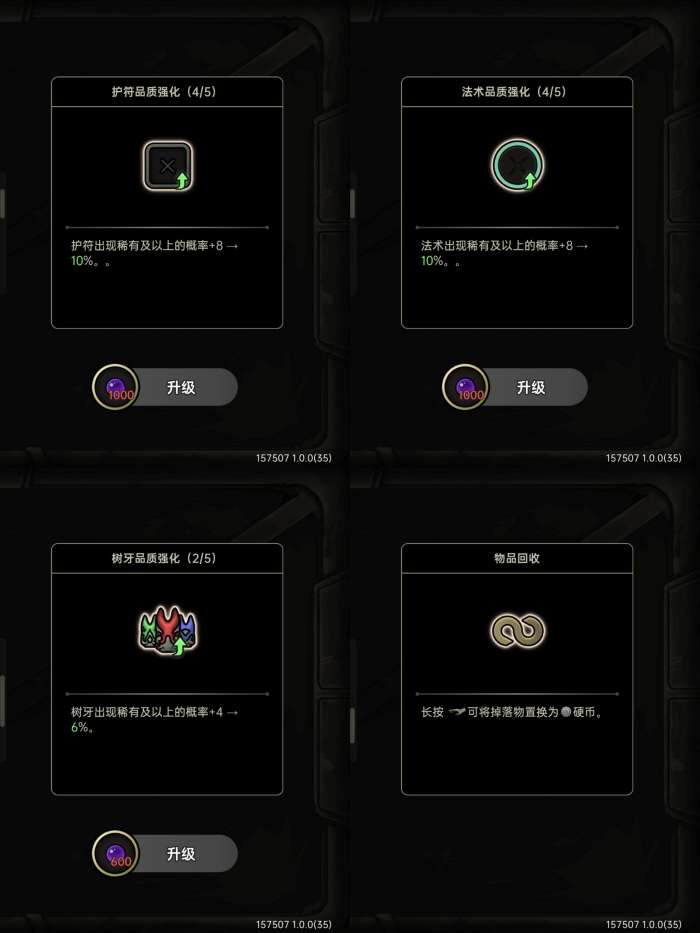 再去先知那里优先点【护符品质】【法术品质】【树牙品质】,有利于刷钱后期阵容成型。