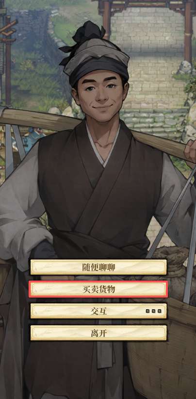 触发交互:点击货郎边上的对话图标。在弹出的菜单中选择“买卖货物”选项。