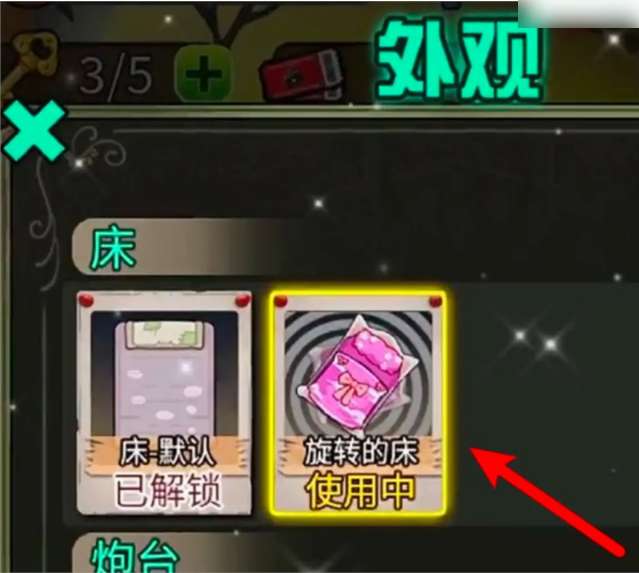 5、进入页面看到旋转的床是在使用中,表示成功解锁了旋转的床了,重新进入游戏就可以使用了。
