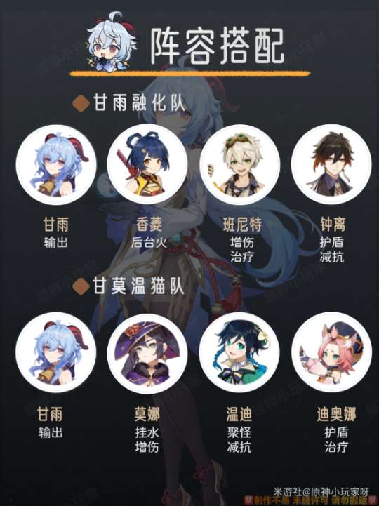 ① 甘雨融化队: 甘雨+香菱+班尼特+钟离