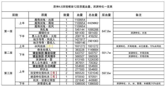 以下为原魔血量表。(深渊特化,元素抗性,特有机制、高额伤害等特化已标注)