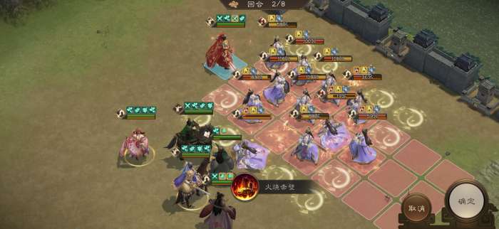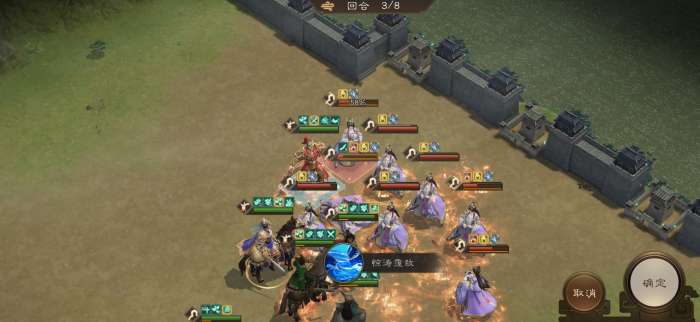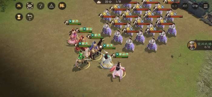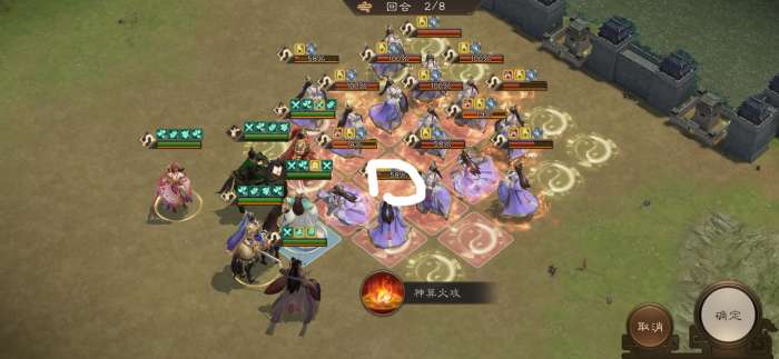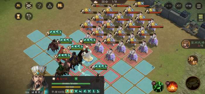 貂蝉走到图八位置开大,然后打残血敌人,或者原地待命也行,毕竟貂蝉的输出可忽略。诸葛亮找残血敌军平A攻击。刘备二技能、曹操一技能也找残血的敌人打。小乔依旧在后方给我军回血。周瑜走到图九位置,用一技能攻击敌军,注意一定要走到有地形效果的格子上,才可以多回50怒。