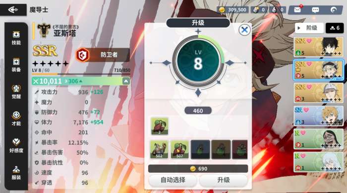 通过手动点击想要使用的升级材料,进行「手动升级」。同时,可以在左侧能力值一览中查看提升的数值。