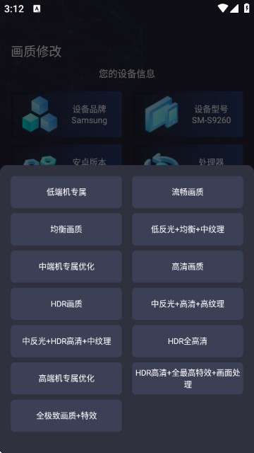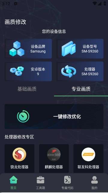 切换到“专业画质”板块,可点击“一键修改优化”快速优化画质,也可在“处理器修改专区”选择对应处理器(骁龙、麒麟、联发科)进行针对性优化。