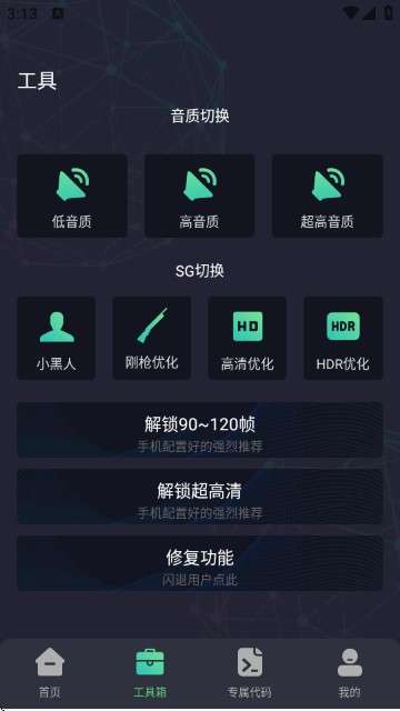 进入“工具箱”板块,可进行音质切换(低音质、高音质、超高音质)、SG切换(小黑、刚枪优化、高清优化等),还可解锁90~120帧、超高清画质,若遇到闪退可使用修复功能。