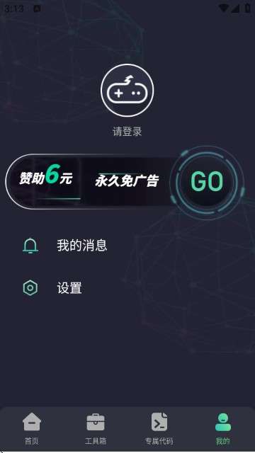 进入“我的”板块,可登录账号,也可选择赞助6元永久免广告,还可查看我的消息、进行设置操作。