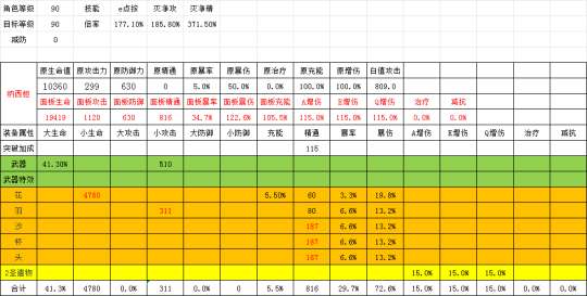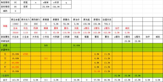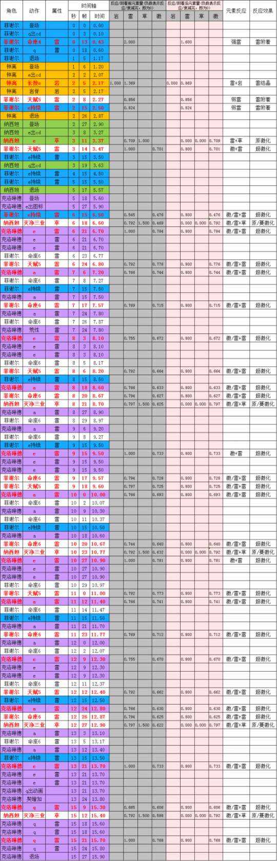 有了各个技能动作的时间、元素附着,根据元素量的衰减,我们可以计算出各个时间点的元素量,再根据高等元素论,进行元素反应的计算,并补全菲谢尔、纳西妲的协同伤害。