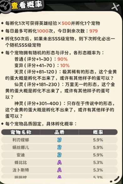 4、孵化机(抽卡)只能抽到普通和变异两种形态的宠物,前期可以适当抽取变异SSS宠物,资质最高。后期只需要用获取的免费抽卡券抽即可。