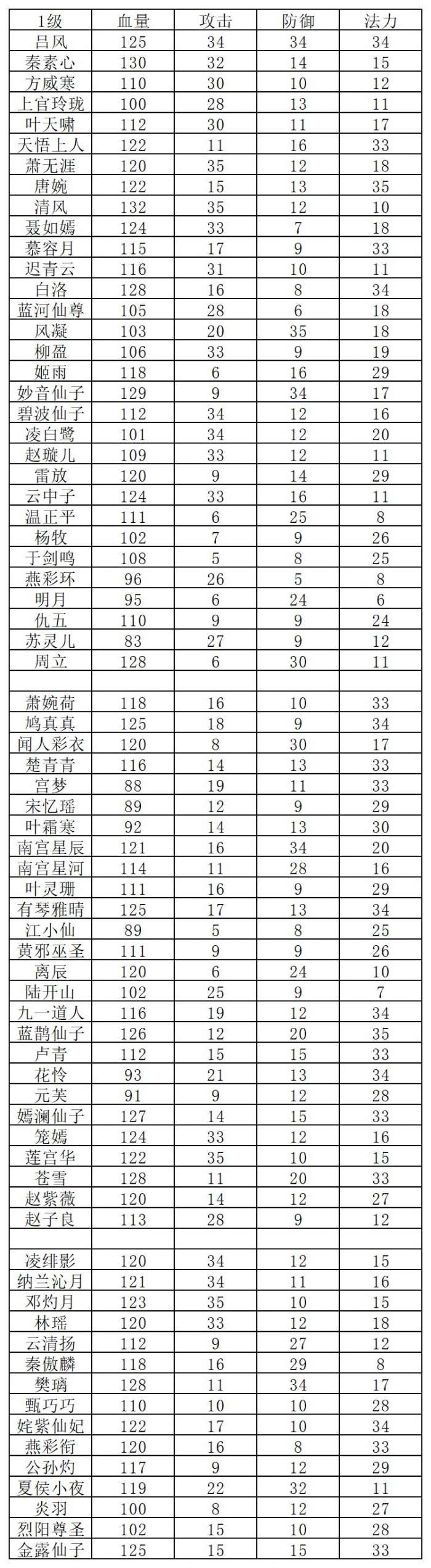 我把所有角色的1级的初始数据贴上去了,大家可以自行搭配