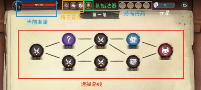 除去每层最后一关一定为首领之外,一共有6种关卡可供玩家选择,分别为:功法、装备、商店、事件、宝箱、休息。