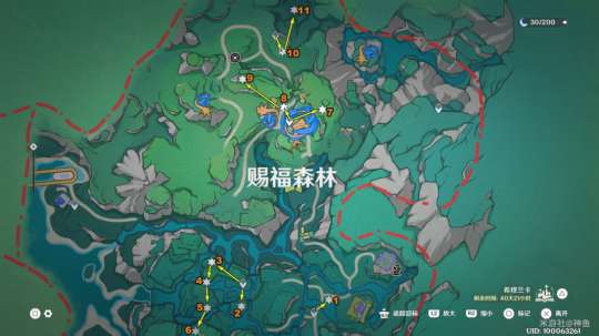 4.8限时地图「希穆兰卡」一阶段共有「11个摩拉盒(4个石堆+7个金属盒)」 ,每个随机掉落1w/1.5w/2w摩拉,分布如下图所示——