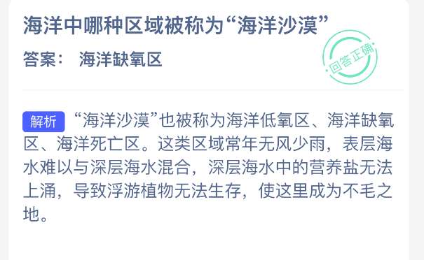软件提交 专题合集 热门手游海洋中哪种区域被称为“海洋沙漠”?【神奇海洋】12月26日新题目已开答!正确答案现已公布,点击领取拼图,一起为修复海洋生态贡献力量!今日正确答案是:【海洋缺氧区】。“海洋沙漠”也被称为海洋低氧区、海洋缺氧区、海洋死亡区。